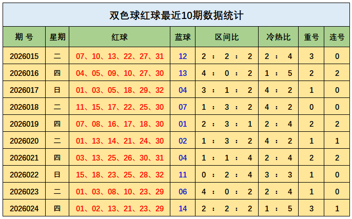 上期回顾:双色球第2026024期开出奖号:红球01、02、13、21、23、29;蓝球14,其中红球三区比为2:2:2,开出3枚重号01、23、29,开出1组连号01、02,蓝球开出四区号码14。
